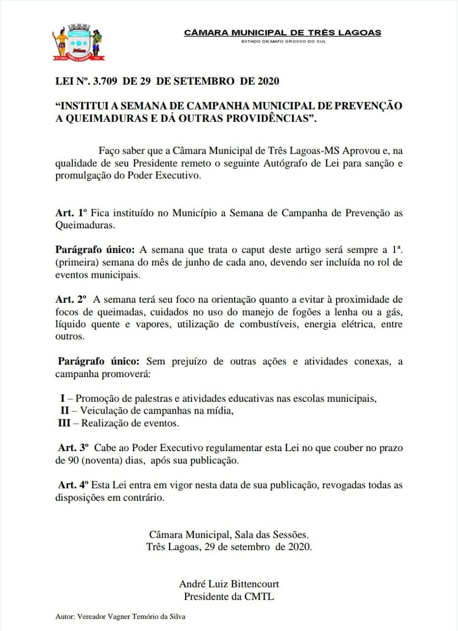 No dia 29 de setembro de 2020, a Câmara Municipal de Três Lagoas/MS, sancionou e promulgou a Lei que Institui ao Município a "Semana de Campanha Municipal de Prevenção a Queimaduras e de Outras Prevenções”, que acontecerá sempre na primeira semana do mês Junho de cada ano.